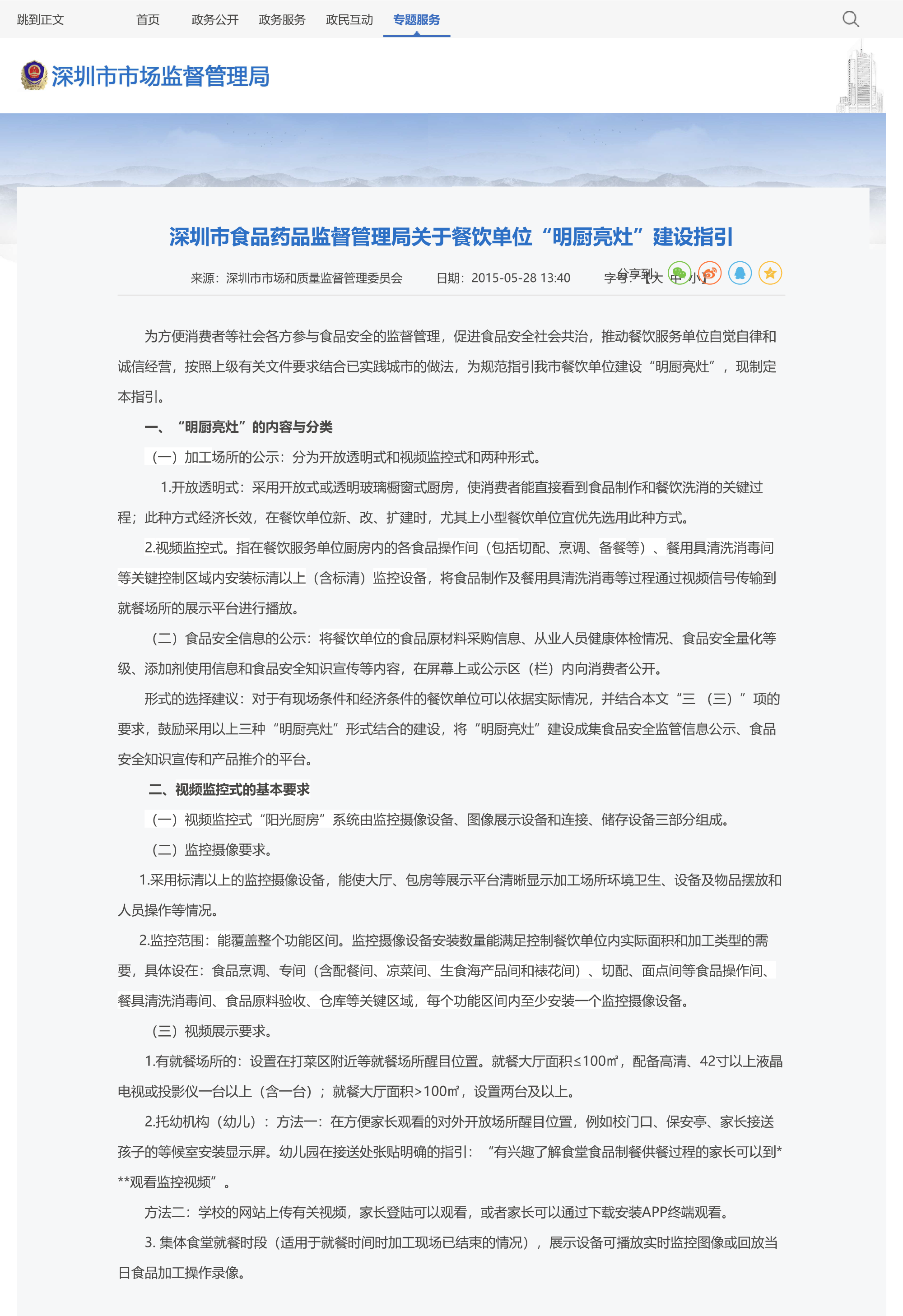 深圳市食品药品监督管理局关于餐饮单位“明厨亮灶”建设指引